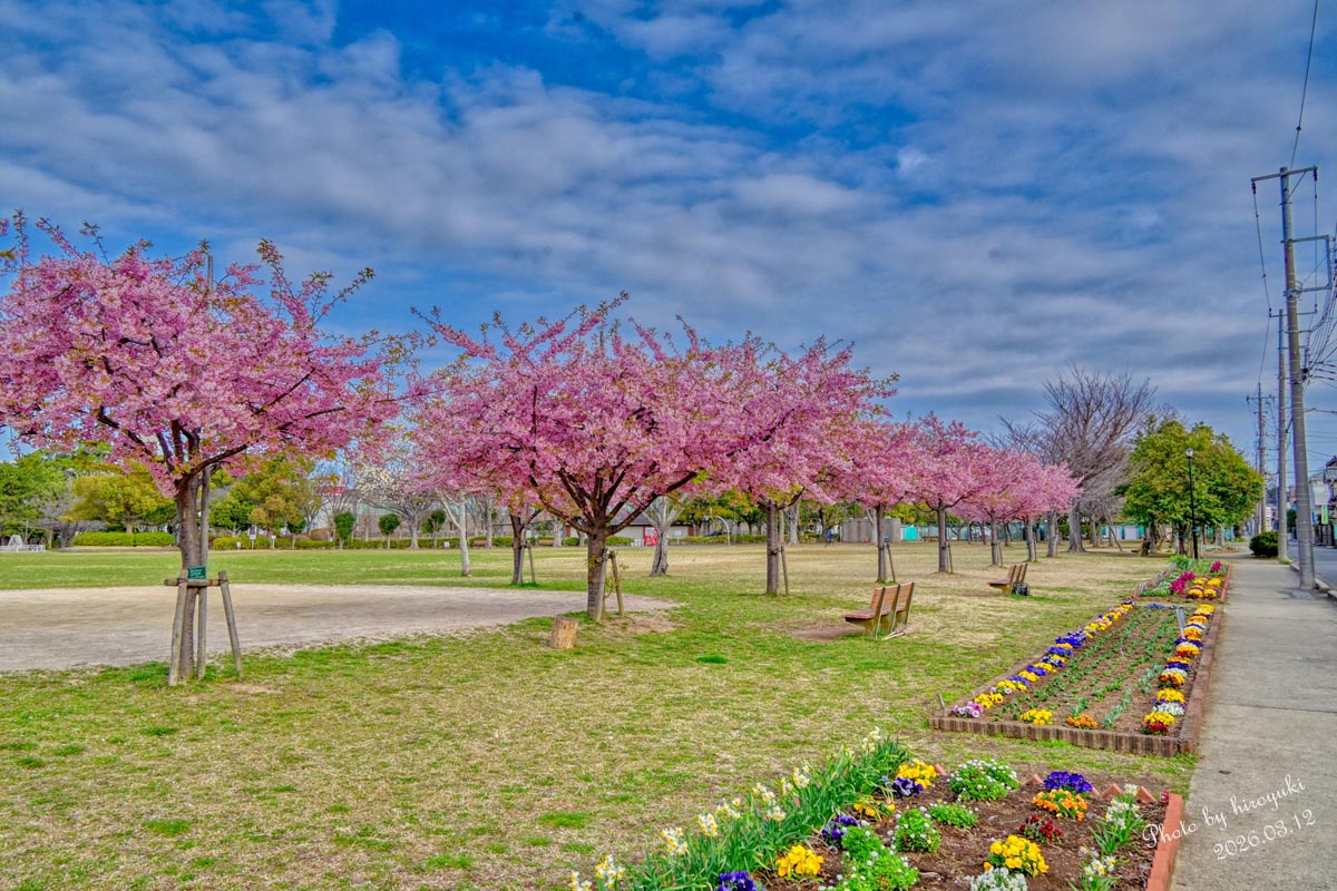 #106:花壇と桜と青空