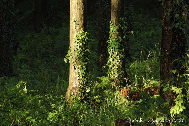 朝日差す近くの林にて